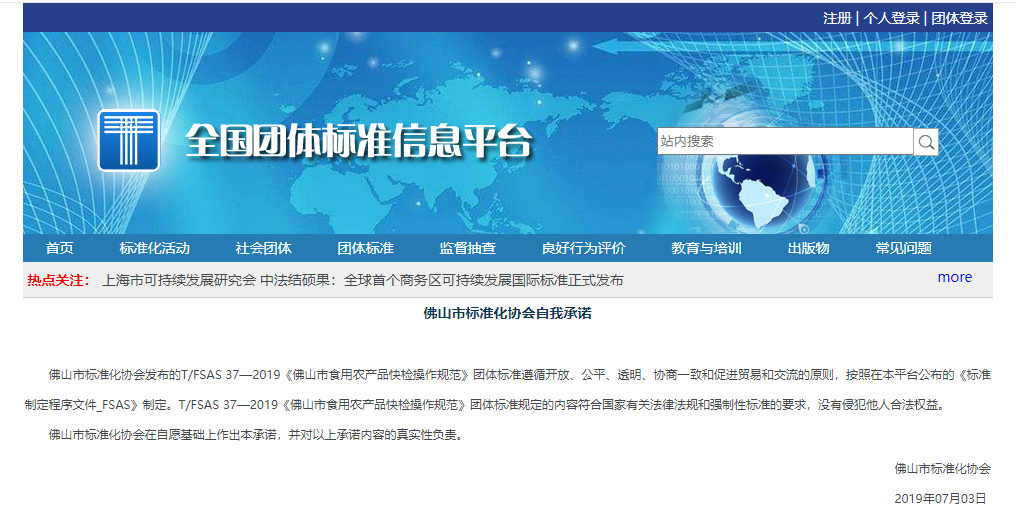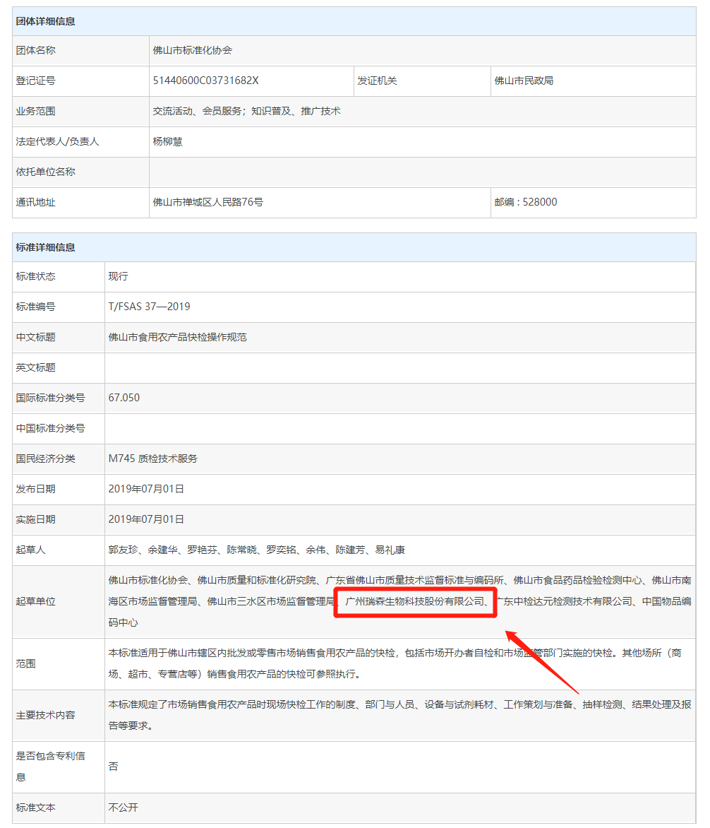 瑞森生物參與制定的T/FSAS 37—2019《佛山市食用農(nóng)產(chǎn)品快檢操作規(guī)范》團(tuán)體標(biāo)準(zhǔn)于2019年7月1日在全國團(tuán)體標(biāo)準(zhǔn)信息平臺(tái)發(fā)布公示。