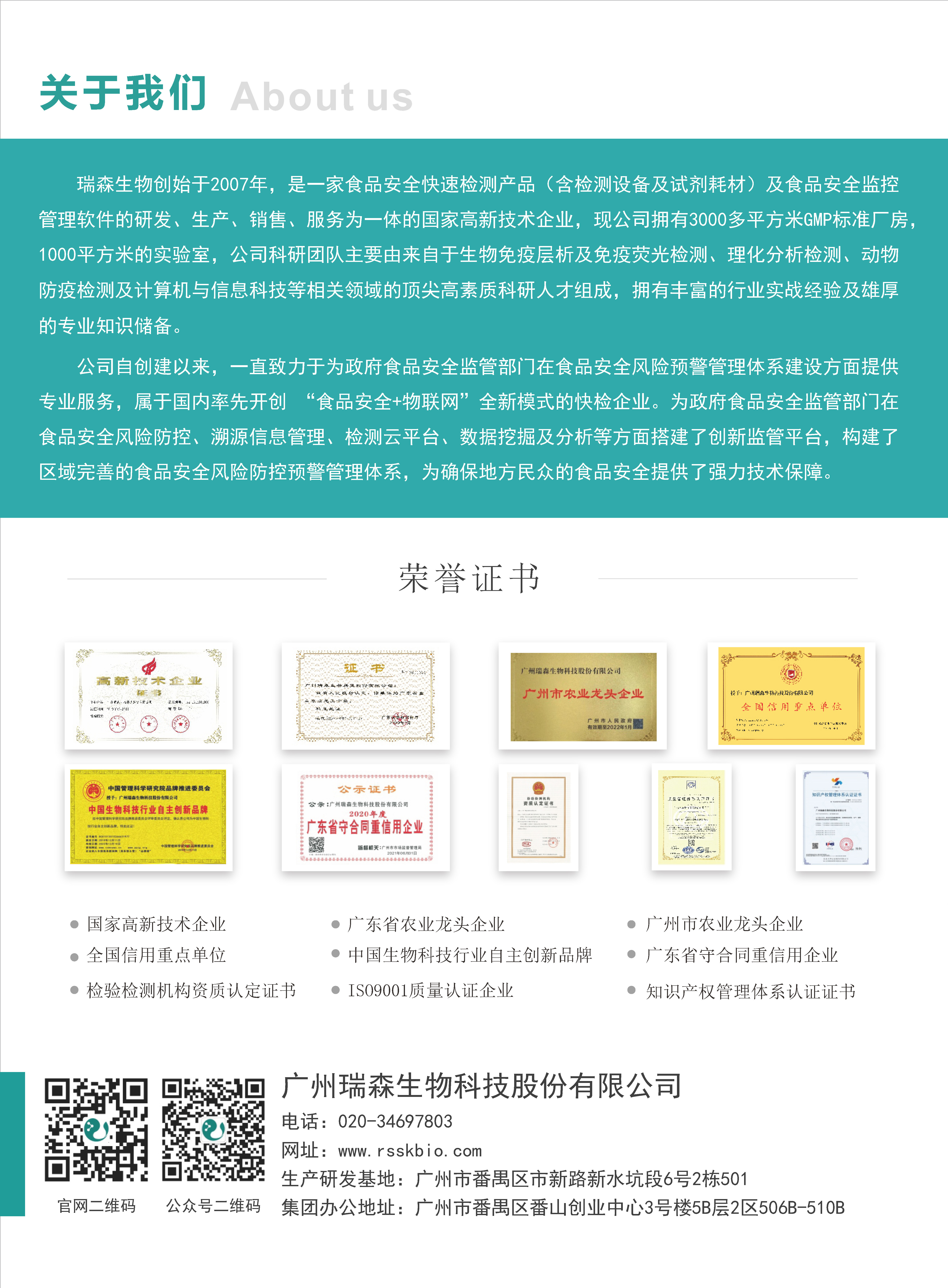 瑞森生物作為廣東省重點農(nóng)業(yè)龍頭企業(yè),一直致力于食品安全檢測行業(yè),至今已深耕十六年之久。公司在食品安全檢測領域發(fā)揮了技術優(yōu)勢,憑借精湛的技術為客戶提供優(yōu)質(zhì)、穩(wěn)定、可靠的產(chǎn)品,為國人食品安全保駕護航,也為推動食品檢測行業(yè)高質(zhì)量發(fā)展貢獻了企業(yè)力量。公司屬國家高新技術企業(yè),廣東省重點農(nóng)業(yè)龍頭企業(yè),廣州市農(nóng)業(yè)龍頭企業(yè),全國重點信用單位,廣東省守合同重信用企業(yè),中國生物科技行業(yè)自主創(chuàng)新品牌企業(yè),目前擁有國家專利29項,國家軟件著作權18項,高新技術產(chǎn)品15項,技術項目研發(fā)5項。公司現(xiàn)擁有快速檢測試劑和設備上百種,核心產(chǎn)品通過農(nóng)業(yè)農(nóng)村部驗證,可為監(jiān)管部門、農(nóng)牧企業(yè)、經(jīng)銷商提供專業(yè)、全面的檢測產(chǎn)品和服務。