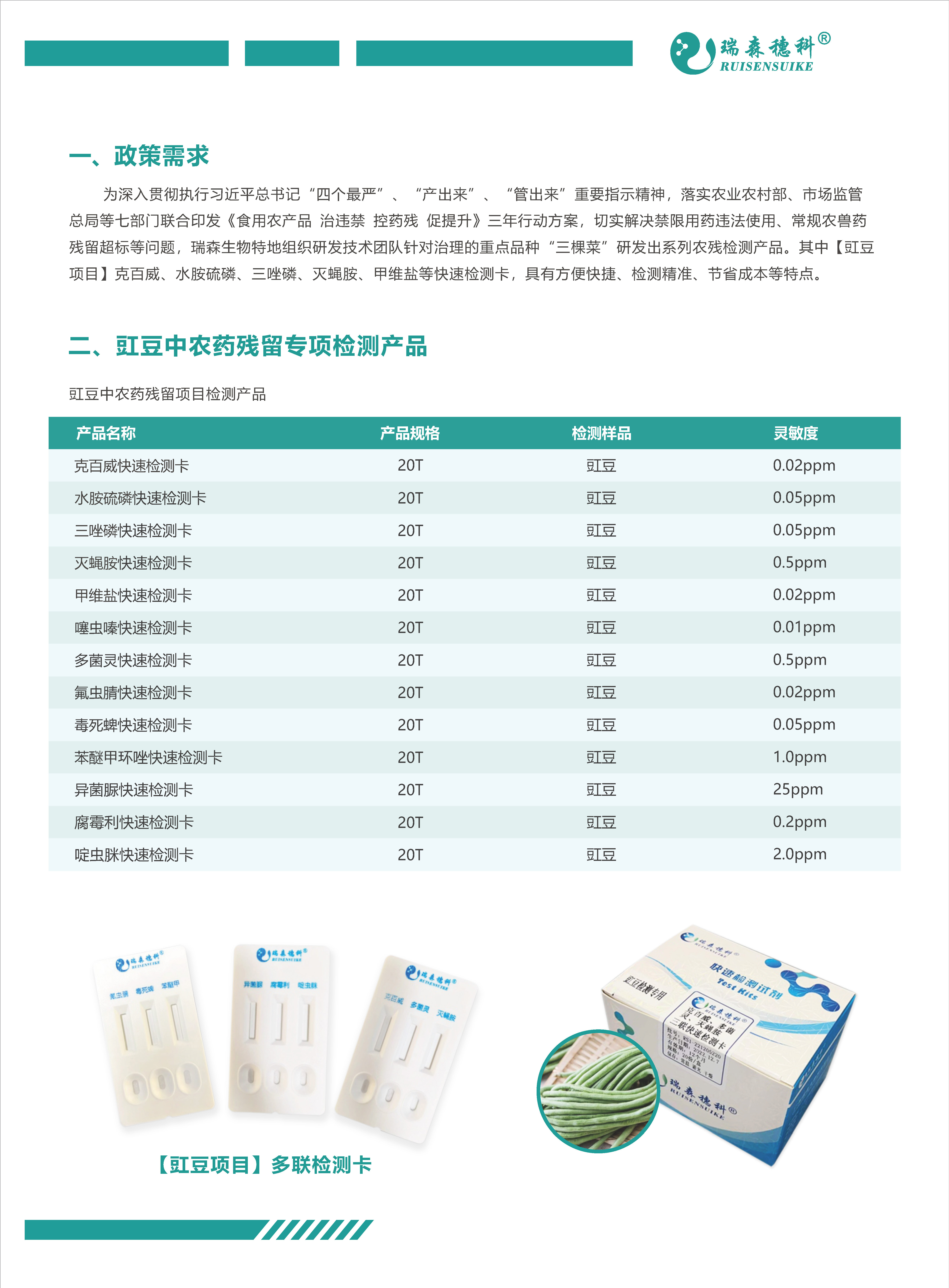 瑞森生物認真學習和貫徹國家《農(nóng)產(chǎn)品質(zhì)量安全法》,積極擁護和響應農(nóng)業(yè)農(nóng)村部《食用農(nóng)產(chǎn)品“治違禁 控藥殘 促提升”三年行動方案》文件精神。針對《方案》中提到的需要重點治理的“豇豆”農(nóng)產(chǎn)品,瑞森生物推出了“豇豆藥殘專項檢測解決方案”,有效解決了豇豆中農(nóng)藥殘留的相關問題。