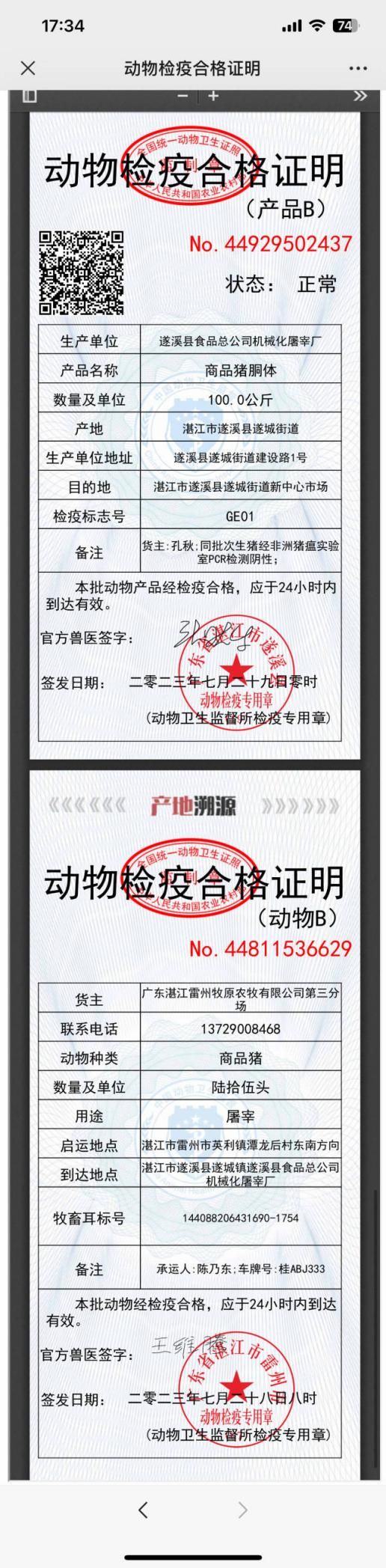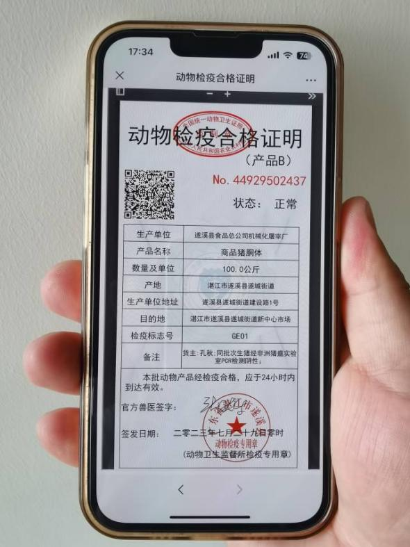 7月29日凌晨12點57分,遂溪縣食品總公司機械化屠宰廠的駐場官方獸醫(yī)開出了湛江市首張動物檢疫合格證明(產(chǎn)品B)電子證照,這是繼本月初無紙化出具動物B證后,湛江市動物檢疫工作在信息化建設上又一次新的突破;標志著湛江市動物檢疫合格證明無紙化改革工作、全鏈條檢疫追溯監(jiān)管體系建設又邁出了歷史性的一步,成為全省首個在產(chǎn)地檢疫與屠宰檢疫環(huán)節(jié)同時實現(xiàn)無紙化出證的地級市。